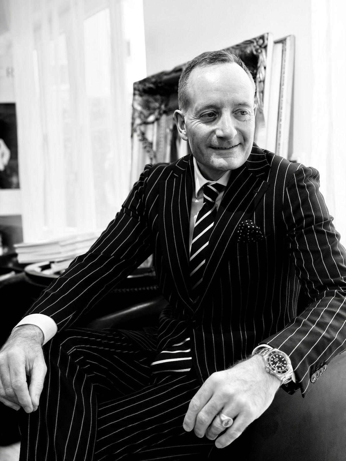 Wenn der Einsatz rund um den Weihnachtsmarkt abgeschlossen ist, bleibt Marco Macri gelegentlich ein Moment für sich: ein Gang durch die beleuchteten Gassen, ein Blick auf den Römer oder ein Glühwein. Für solch besondere Anlässe hat ihm Maßdesigner Stephan Görner einen hellbeigen Nadelstreifenanzug aus mollig warmen Alpacastoff auf den Leib geschneidert – passend für das Wetter auf dem Weihnachtsmarkt und ein Kontrast zum Arbeitsalltag zwischen Absperrmodulen, Transportfahrzeugen und Einsatzplänen.